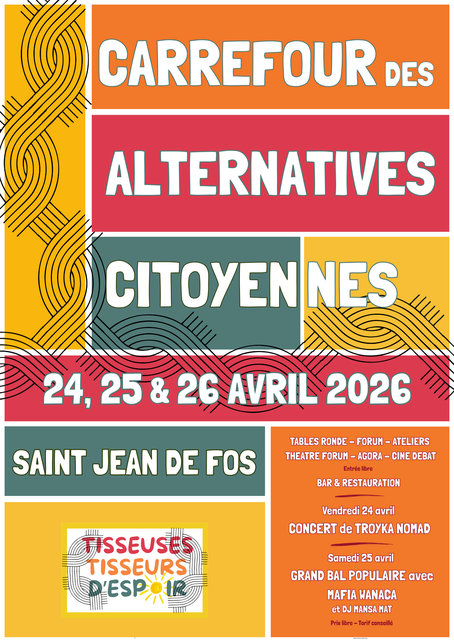 https://tisseurs-tisseuses-despoir.jimdofree.co " Le 24, 25 et 26 avril à Saint Jean de Fos se tiendra la première édition du Carrefour des alternatives citoyennes de l'association Tisseuses et Tisseurs d'espoir." Au programme…