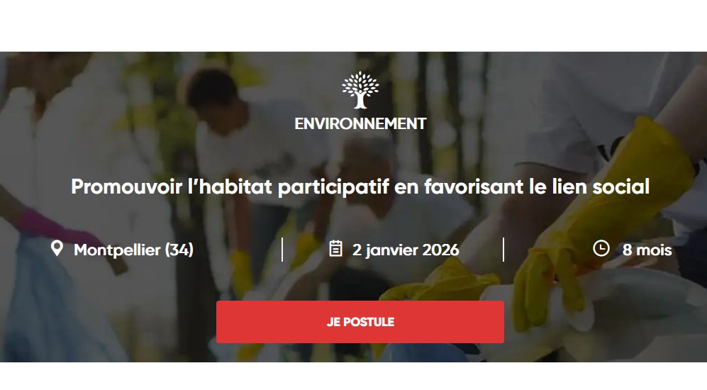 Inscrivez-vous https://www.service-civique.gouv.fr/trouver-ma-mission/promouvoir-lhabitat-participatif-en-favorisant-le-lien-social-69306755775578279f13ad2f?preview=true&backRecruitment=true&useapirest=false